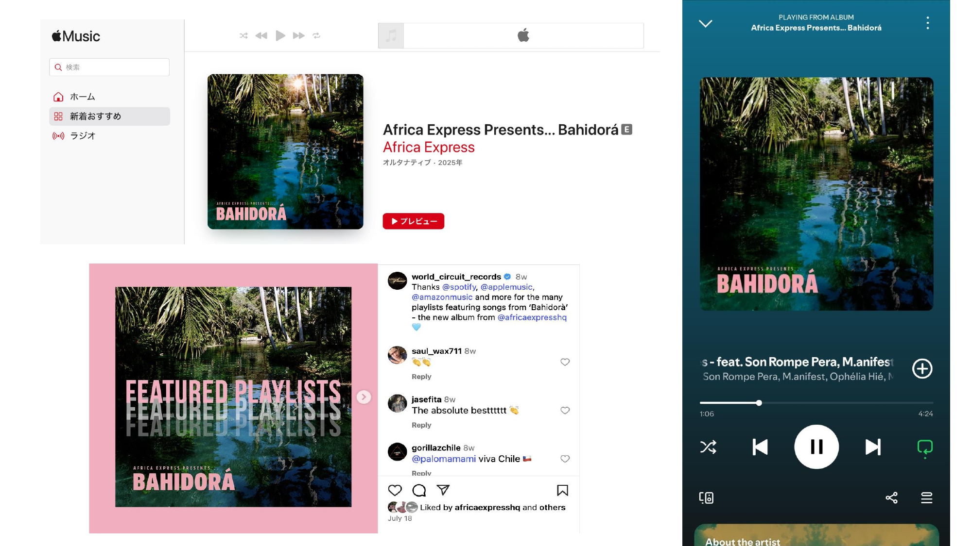 El álbum fue interpretado por Africa Express en festivales como Roskilde (Dinamarca) —uno de los encuentros musicales más influyentes de Europa— además de WOMAD (UK), Montreux Jazz (Suiza) y showcases en Roma, Berlín, Londres y Ámsterdam. Cada presentación no sólo recreó en el escenario la esencia de Bahidorá, sino que la llevó frente a managers, agentes, medios y artistas clave para la industria musical internacional.